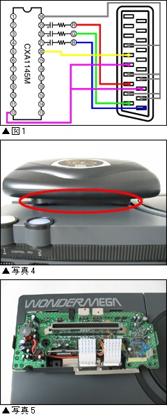 21ピン端子に繋ぐ場合は、RGB信号に加え同期信号としてビデオコンポジット、さらにAV CONTROLとYS用の電圧として+5Vを配線する必要があります(図1)。