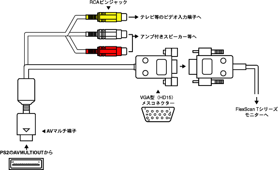 ・PS2 Linux Kit同梱のVGAアダプターとピンアサイン互換モードあり。 ・ビデオ出力、音声出力用ピンジャックを装備。 ・ノイズ耐性に優れたシールドケーブルを採用。 ・気休めを求めるアナタのためのフェライトコア付き。 ・非保証のヒミツ機能付き。 ![]() 本ケーブルの15ピンコネクターには、ヒミツのスイッチが付いています。通常は「ON」にしてご使用ください。 「OFF」にすれば、Linux時に分離同期信号は出ず、純正VGAアダプターと互換の出力になります。 「ON」でなにか不具合が出る場合は「OFF」で試してみてください。 「OFF」時は通常のSync on Green対応モニターでも使用可能なはずです。 しかしじつは、「OFF」時は単に同期分離回路への入力をカットするだけではなく、入力を緑信号からS端子出力のY信号に切り替えているのです。 VGAモード時はこの信号は非出力となるのでH/V信号も出ないわけですが、起動時や通常のPS/PS2ソフトをノーマルに起動した場合は同期分離が行われ、H/VのピンにNTSC周波数準拠の同期信号が出ます。 これがなにを意味するかは分かる人には分かるでしょうが、つまり水平同期周波数15KHz対応のRGBモニター(X68000用モニター等)に接続表示が可能になるということです。 すなわち「OFF」時は、「PS/PS2用15ピンRGBアダプターHG」と同等の機能になるわけです。 もちろんD-SUB15ピン端子に接続するためには、「DOS/V→PC-98」系のジェンダーチェンジャーなどが必要になります。 H/V独立同期に対応する中期型以降のTOWNSモニターの場合、起動時は「OFF」VGA切替後は「ON」にすると裏VGAが映るものがあります。 とはいえ複数のモニターでの検証が十分ではないため、当面この機能は非保証です。