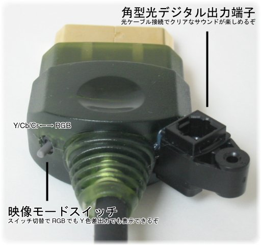 映像はWEGAのRGB/Y色差入力によるクッキリな大画面で、音声は5.1chデジタルサラウンドで聞きたい人向けのXB→WEGA系モニター直結型のケーブルです。